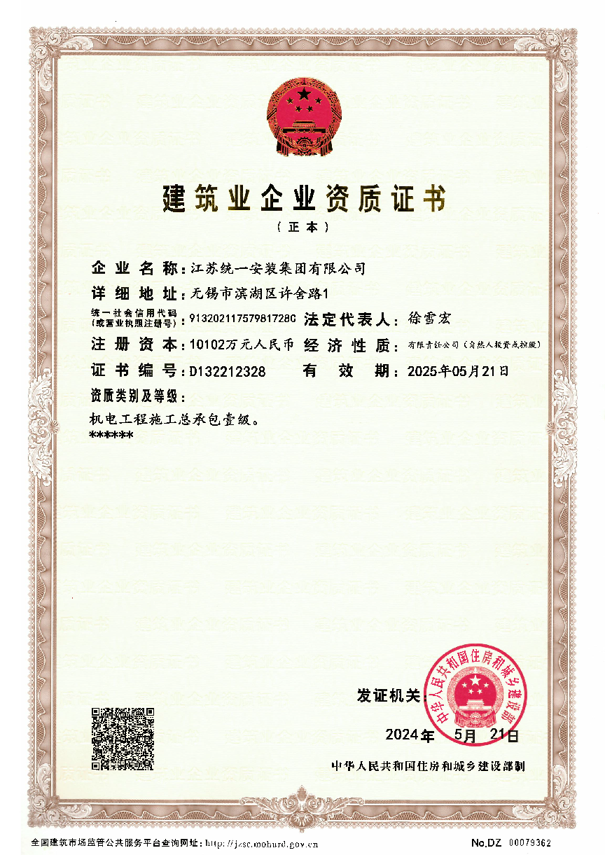 近日,江苏统一安装集团有限公司资质升级再获新突破!公司成功晋升“机电工程施工总承包壹级”资质!